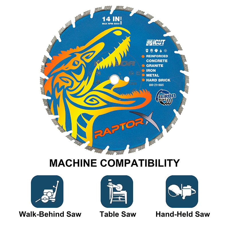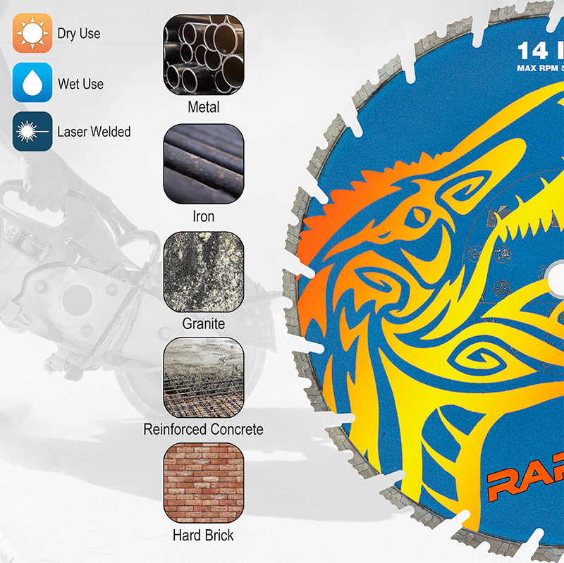 The Raptor X Diamond Blade with Turbo Start Segments is engineered for cutting reinforced concrete, granite, iron, metal, and hard brick. Designed for both wet and dry use, this blade ensures consistent performance in demanding applications, including rescue operations and first responder tasks.