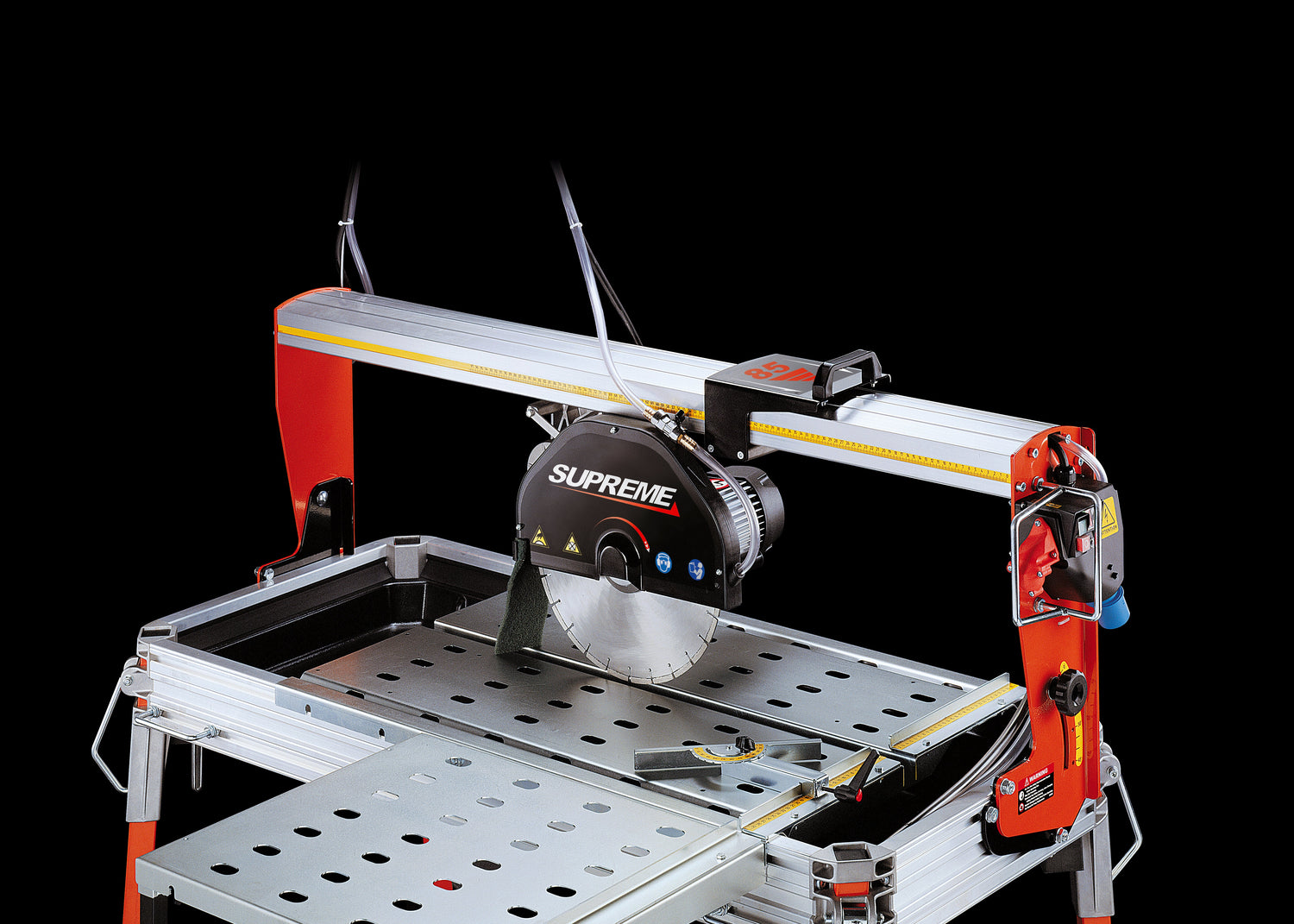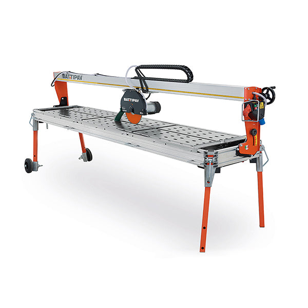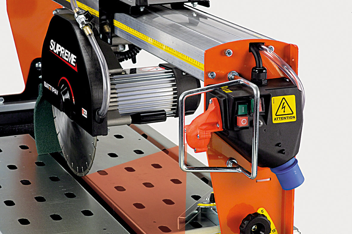 The SUPREME 200S is a single-phase bridge saw designed for cutting natural stone slabs, including granite and marble. The cutting head moves manually along an aluminum bridge rail, providing controlled and precise straight and angled cuts. It operates with a 300 mm diamond blade and includes standard features such as a laser guide, adjustable fence, and water recycling system.